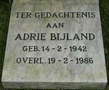 Adrie Bijland Personalia Naam:Adrie Bijland Geboren:14 februari 1942 Overleden:19 februari 1986 Begraafplaats:Oude Torenhof in Alblasserdam Levensloop 0 jaar: geboorte Adrie 44 jaar: overlijden Adrie