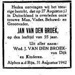 er is op 20 september 1947 in Alphen aan den Rijn een akte van overlijden opgemaakt. Jan is op 27 augustus 1942 te Dachau om 8:35 uur overleden